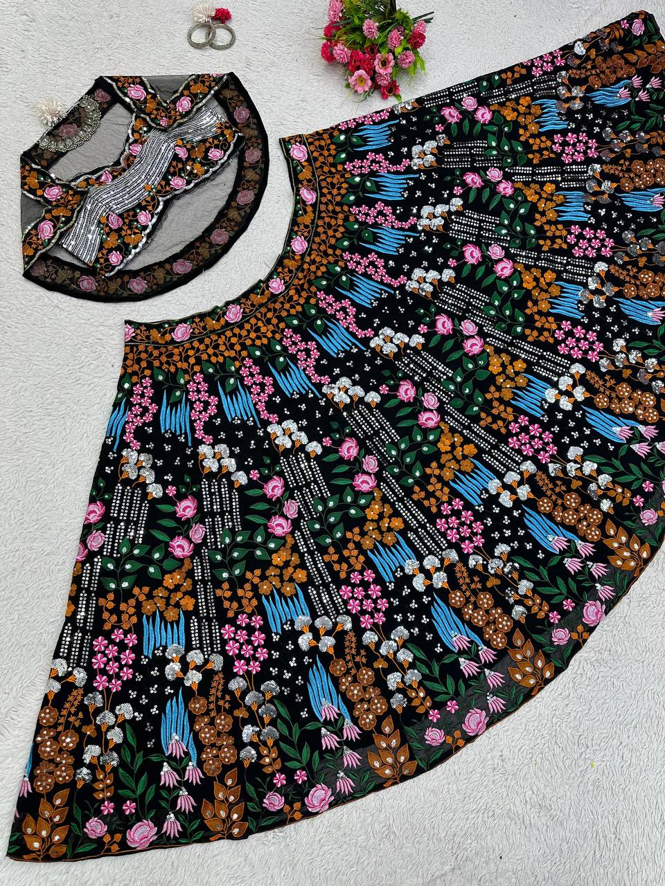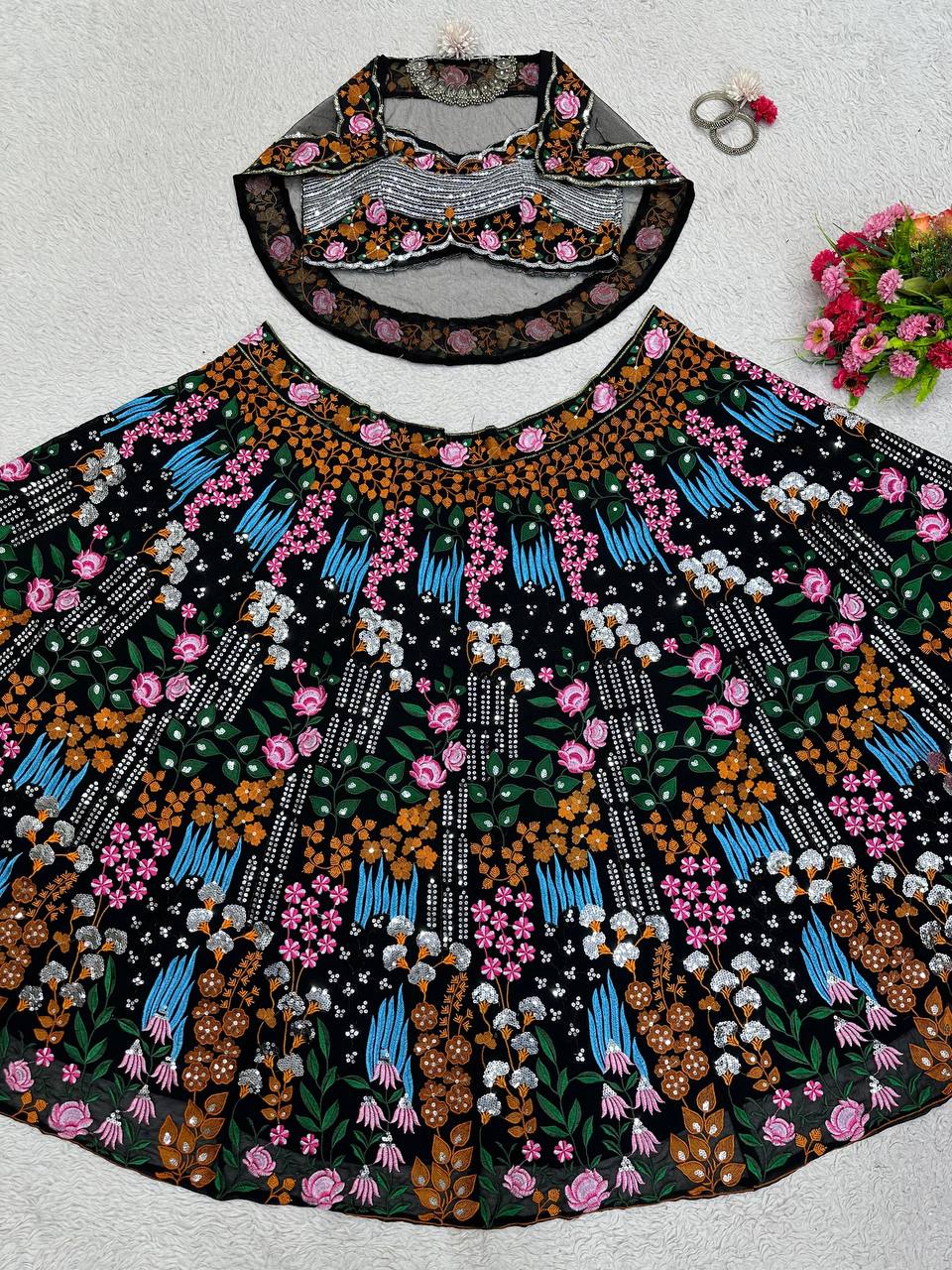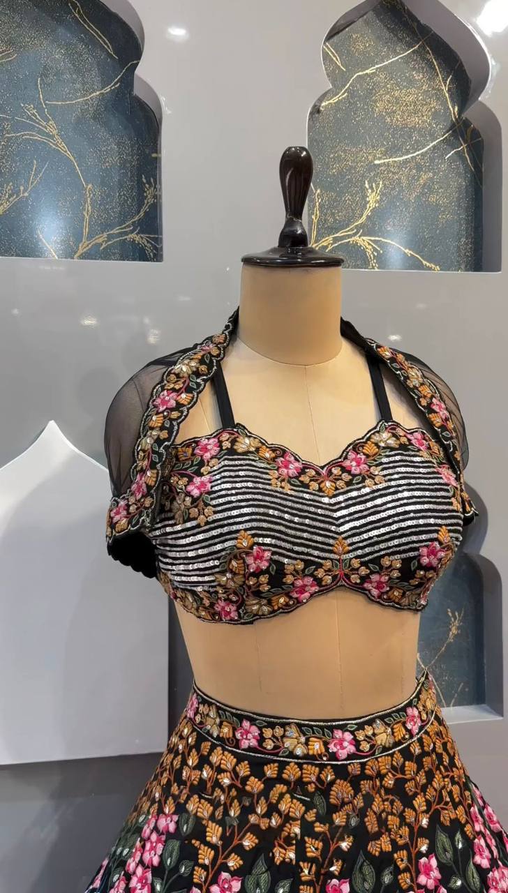 Amazing Black Color Georgette Fabric With Thread And Sequence Work Lehenga Choli With Dupatta