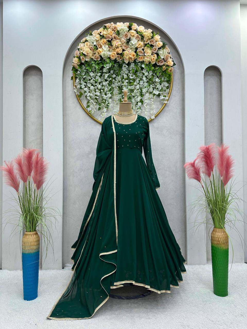 Amezing Green Colour Full Stiched Moti Worked Gown With Beautiful Lace