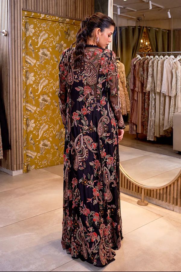 Beautiful Black Georgette Multi Color Thread Work Saree With Shrug