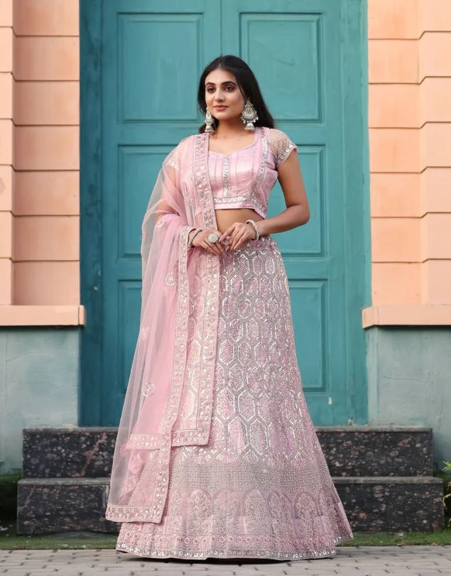 Pink Soft Net Embellished Glitter Dori Lehenga Choli With Dupatta