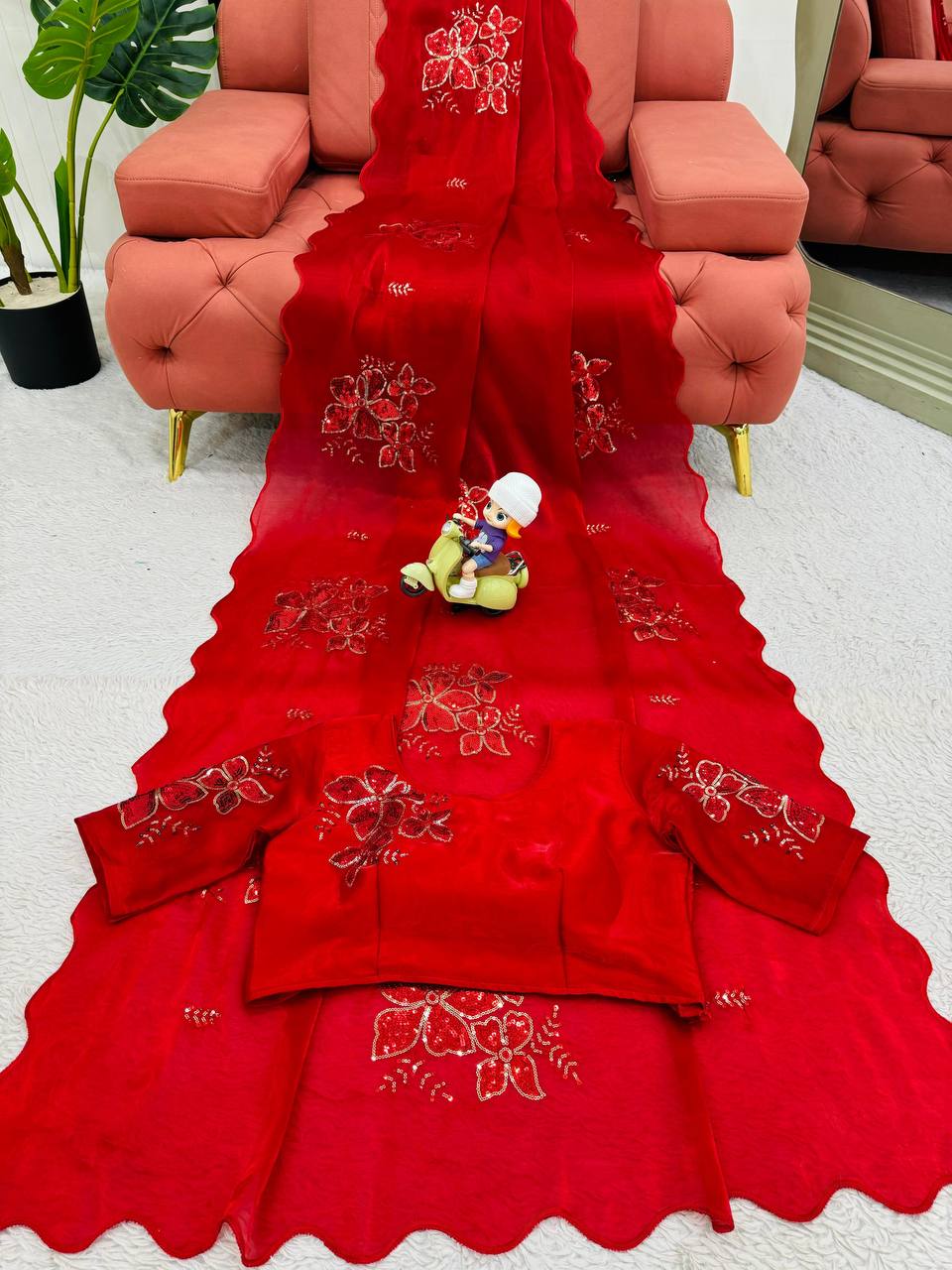 Beautiful Red Colour Jimmy Chhu Silk Thread & Sequences Work Saree