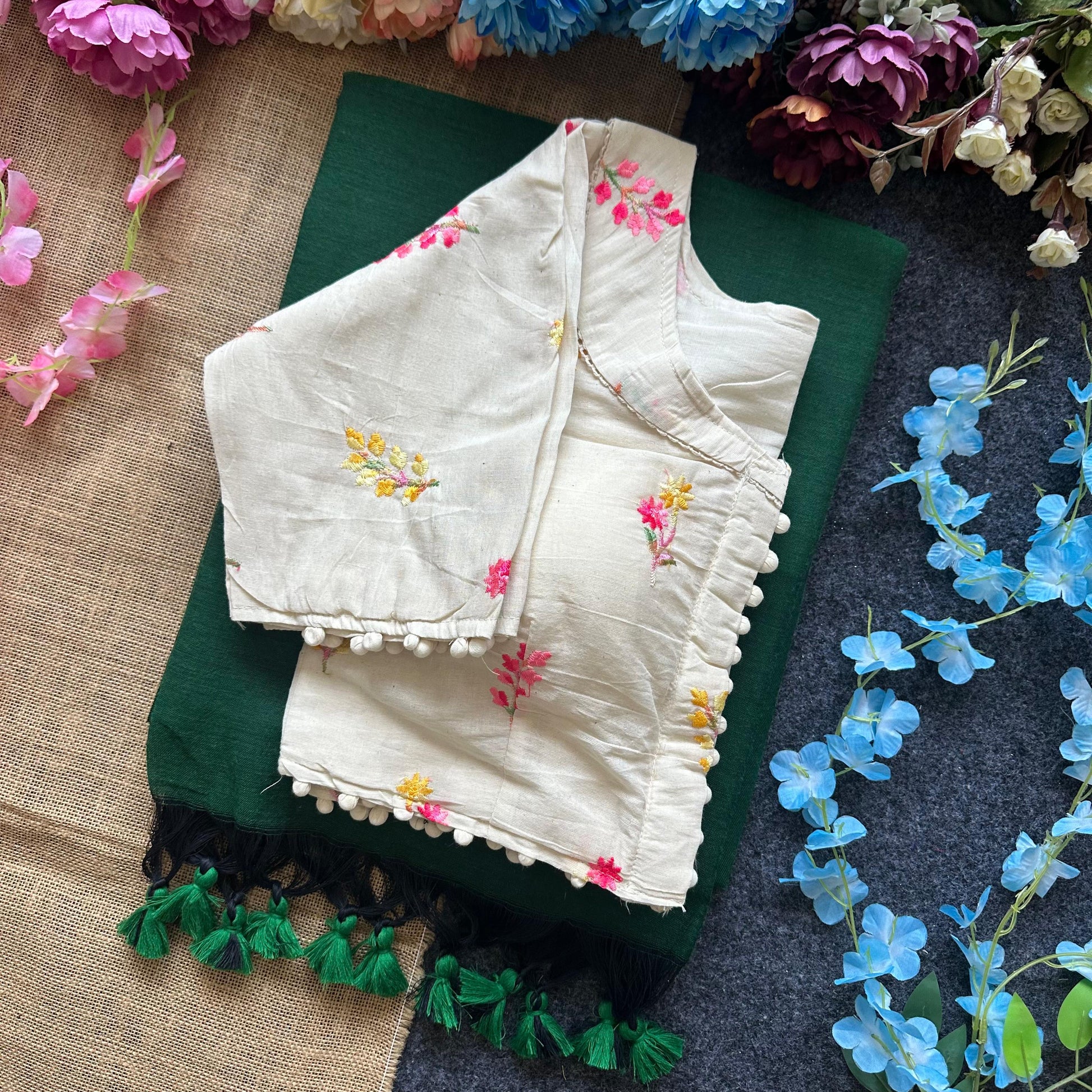Bottle Green Pure Khadi Cotton Saree With Fully Stiched Work Blouse