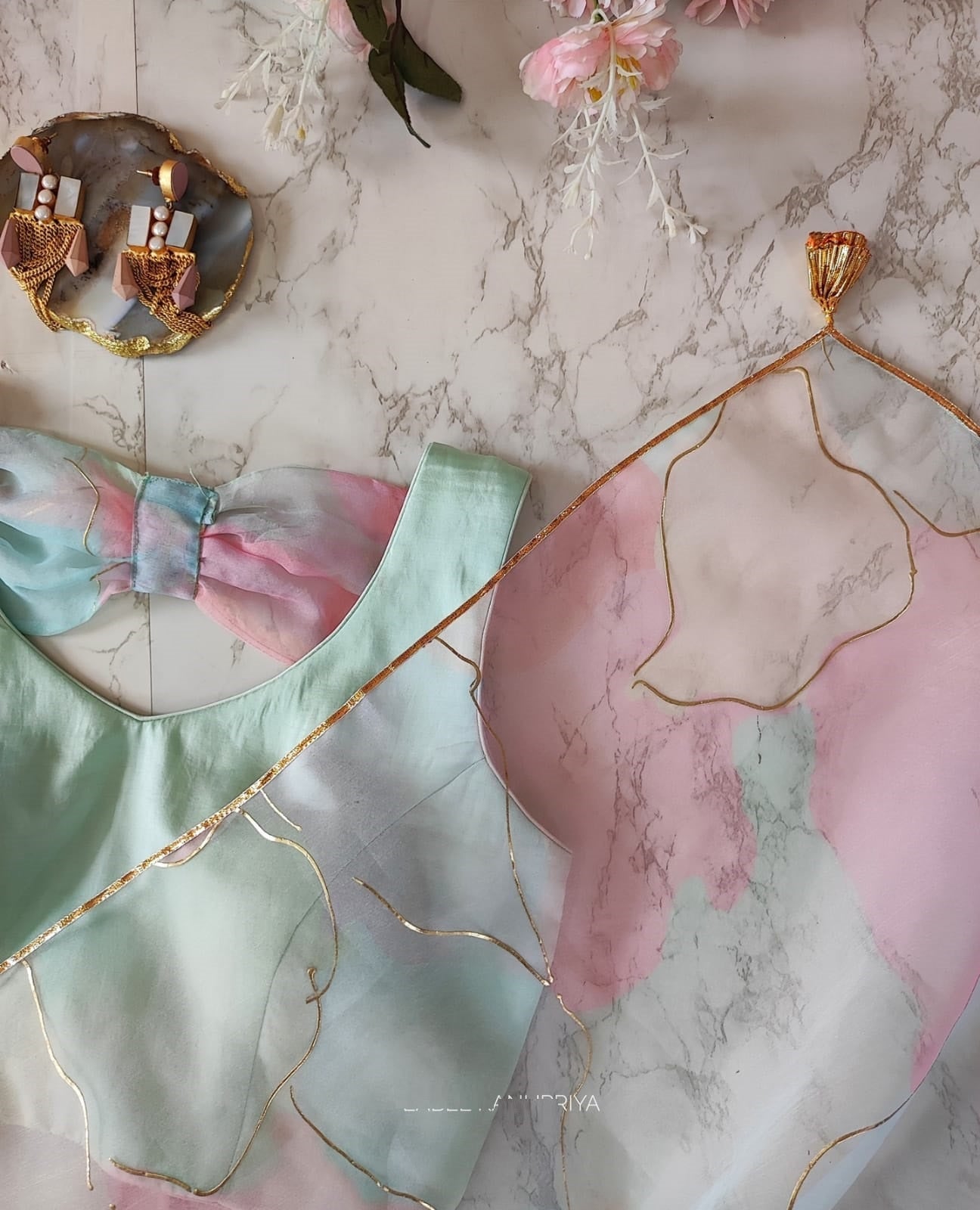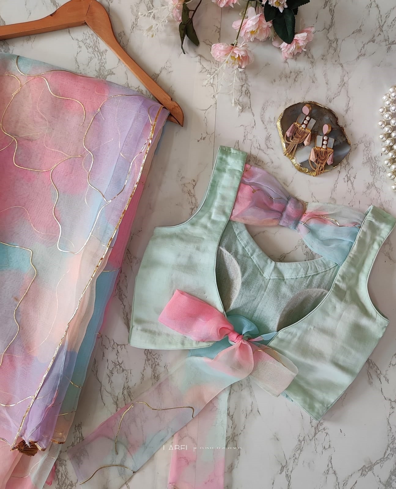 Charming Multi Color Soft Organza Silk Hand Foil Print Saree Blouse For Women