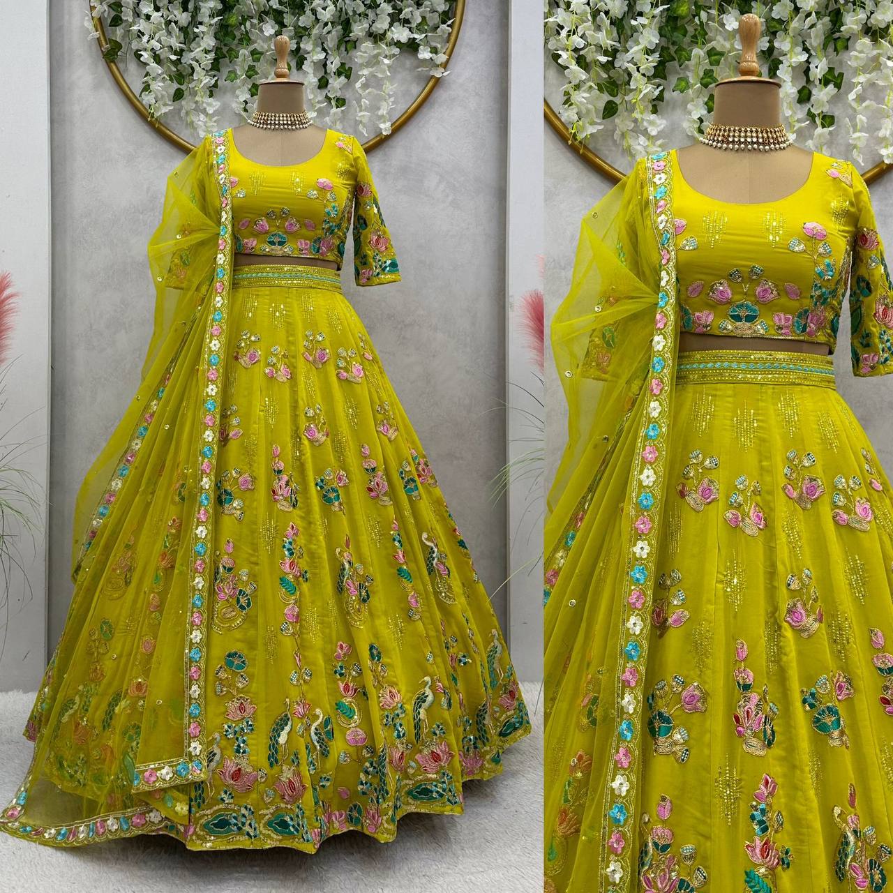 Designer Yellow Colour Georgette Fabric With Long Flair And Thread & Sequences Work Lehenga Choli