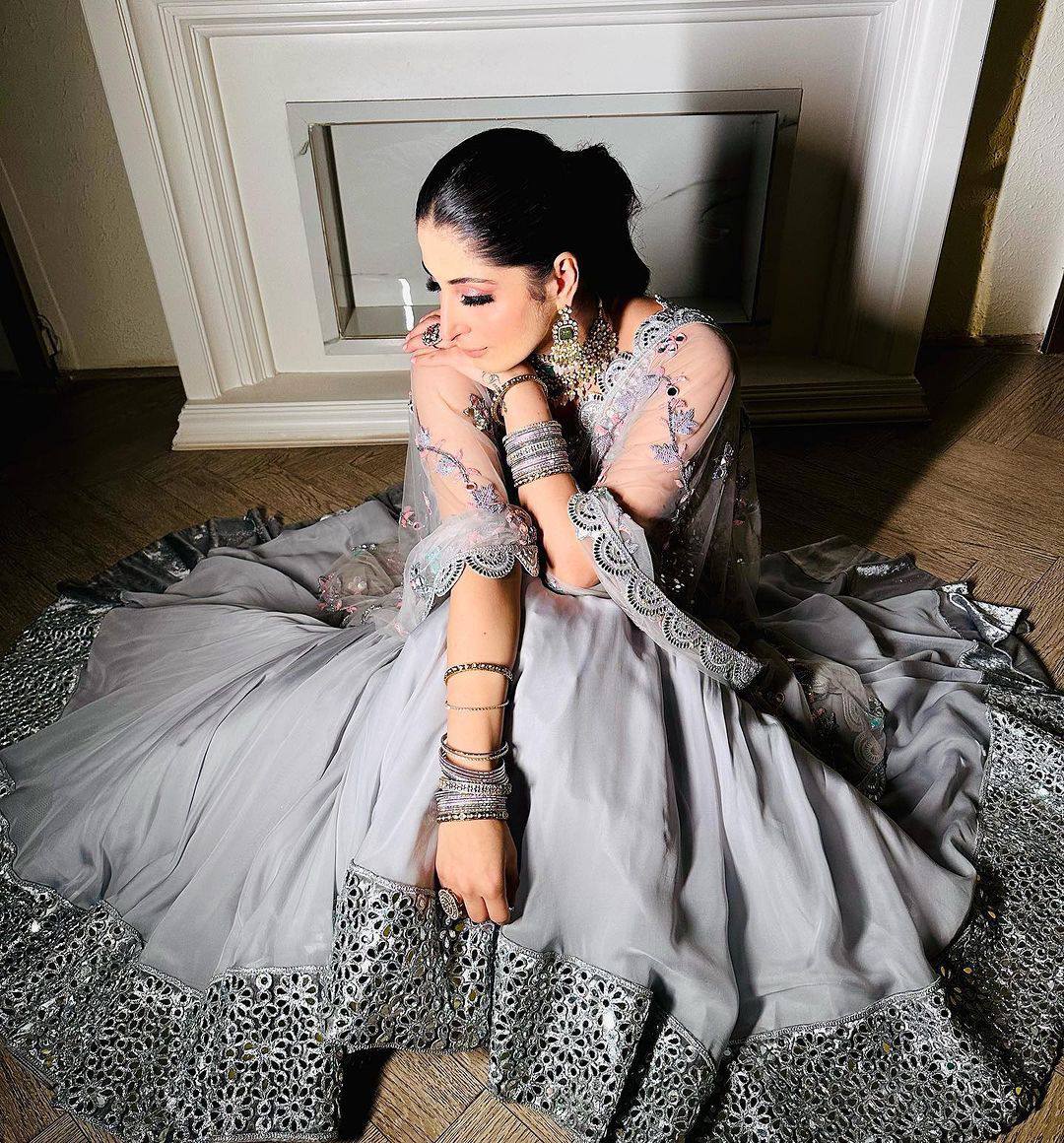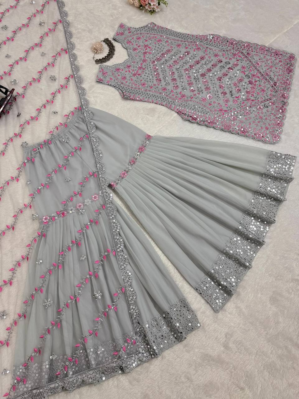 Grey Color Georgette Sequence Work Stitched Sharara Suit