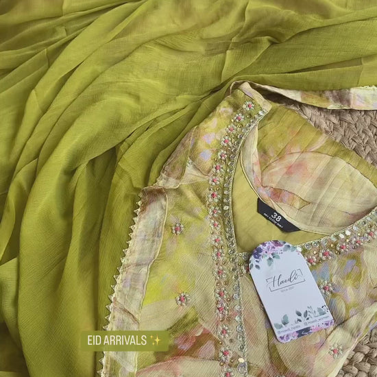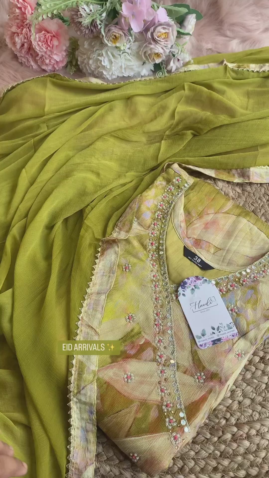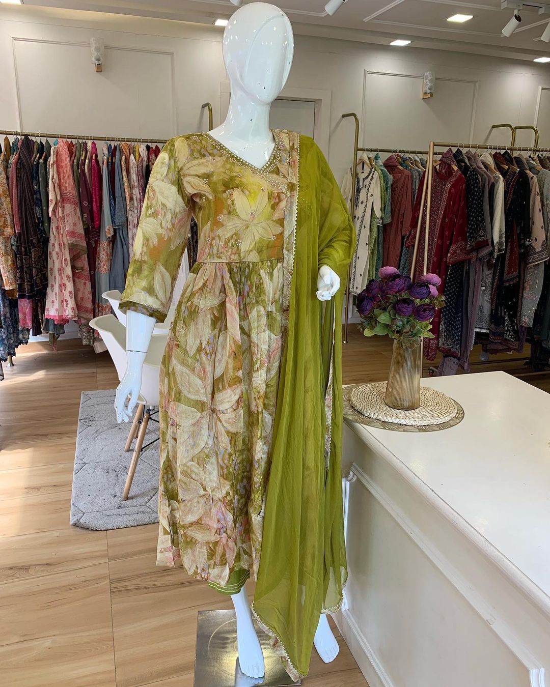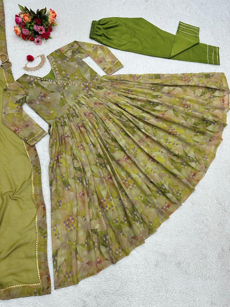 Mehndi Green Pure Georgette Handwork Readymade Suit Set For Any Girls Women