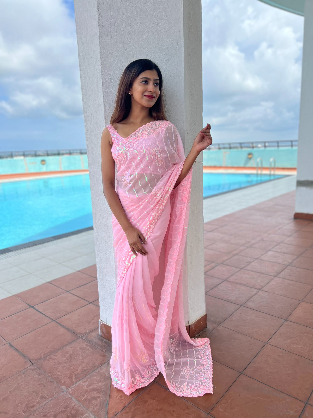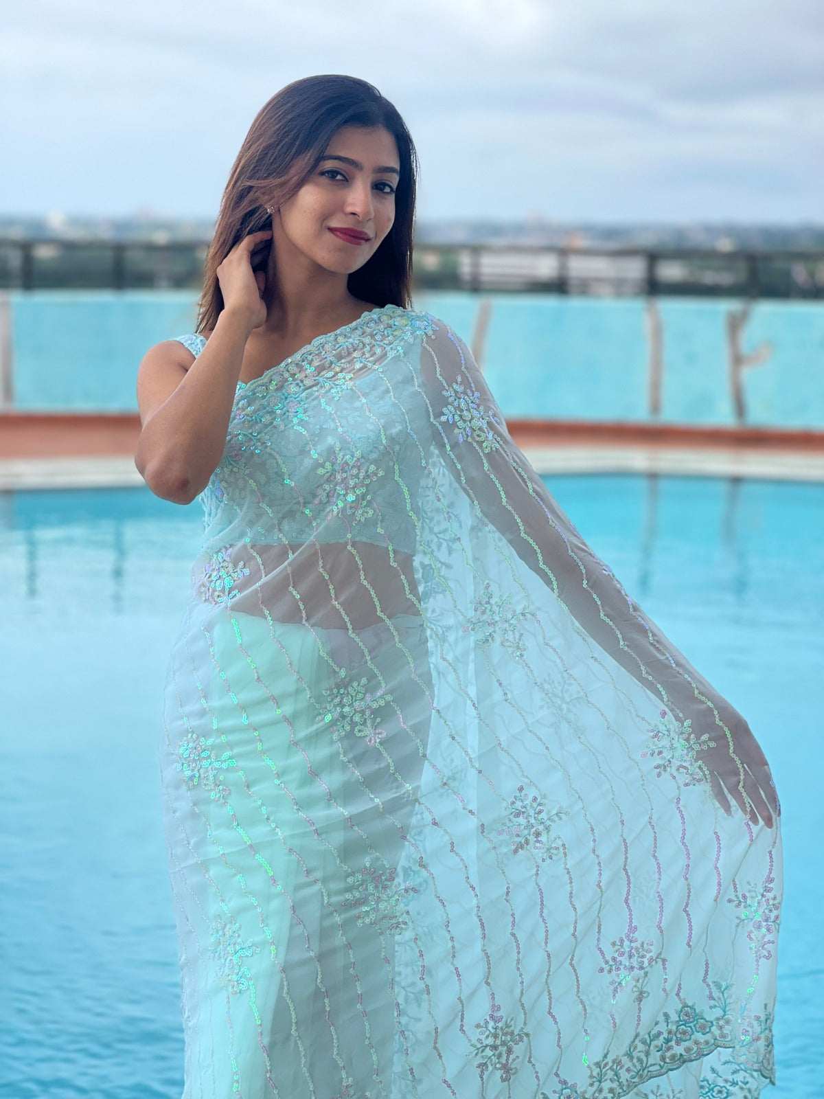 Classic and elegant, this saree will be a perfect addition to your ethnic wardrobe, offering a soothing and pretty wibe the adornment of seqwance work makes it impeccable