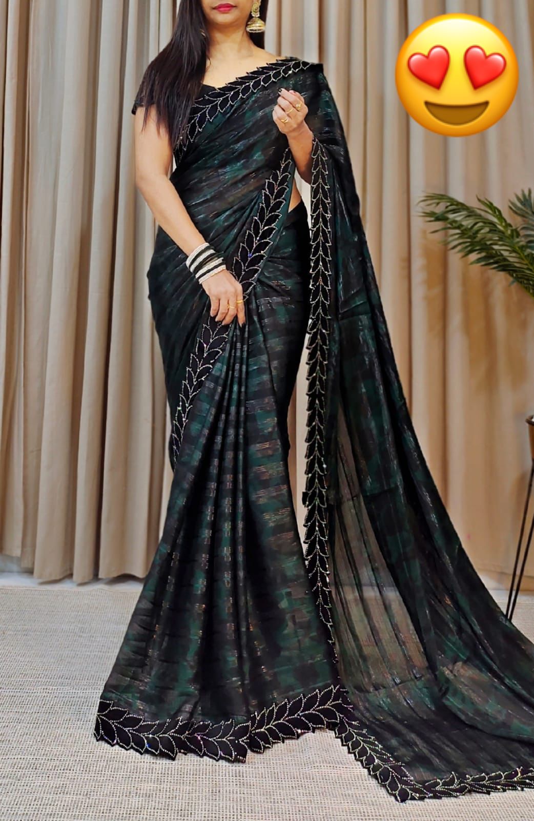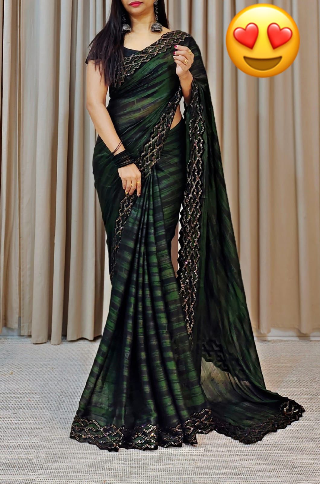 Party Wear Moss Zari Chiffon Saree with Velvet Cut Swaroski Work Border