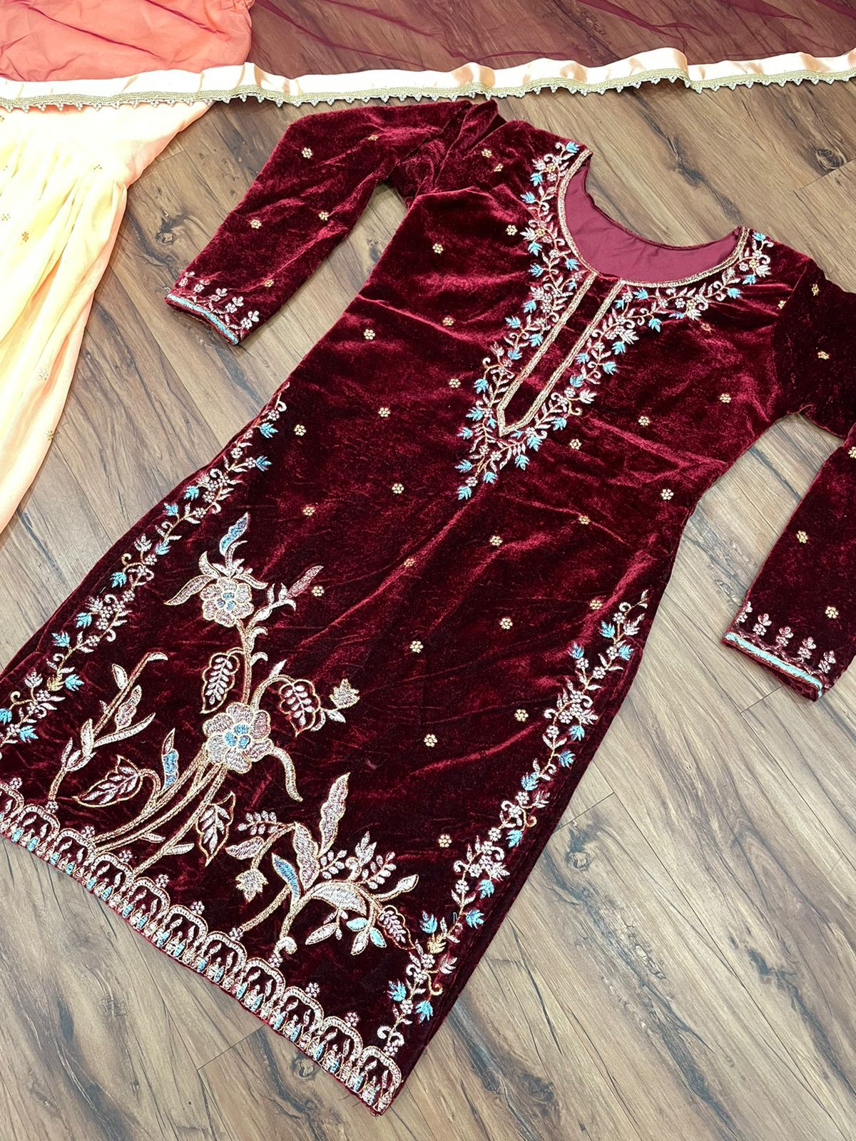 Designer Suit On Heavy Velvet Fabric and Thread work and sharara on Georgette Fabric with inner and thread work and dupatta on soft net Febric with Lace work .