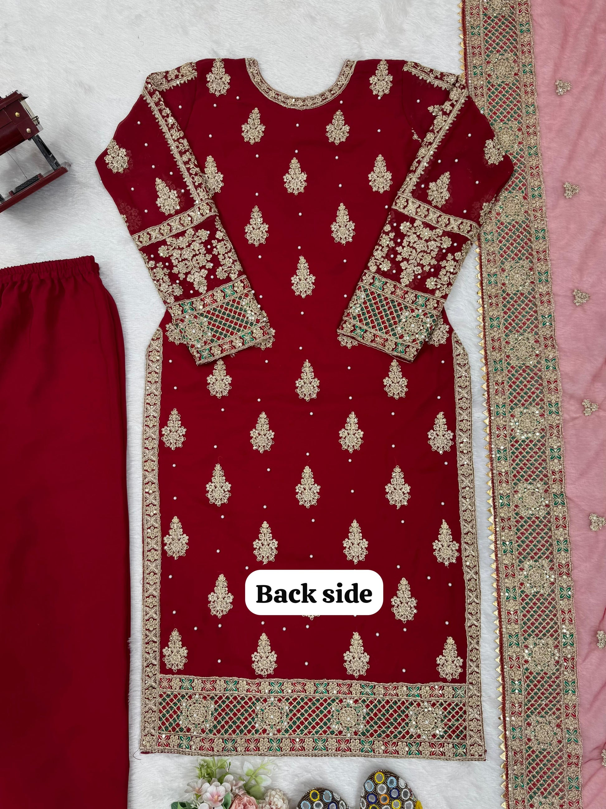 Beautiful Designer Suit On Faux Georgette febric with inner With Thred & Sequnce With Pearl work and Plazo on also Faux Georgette Febric With Thred & Sequnce work and and Dupatta on Soft Net Febric with Thred & sequnce work.