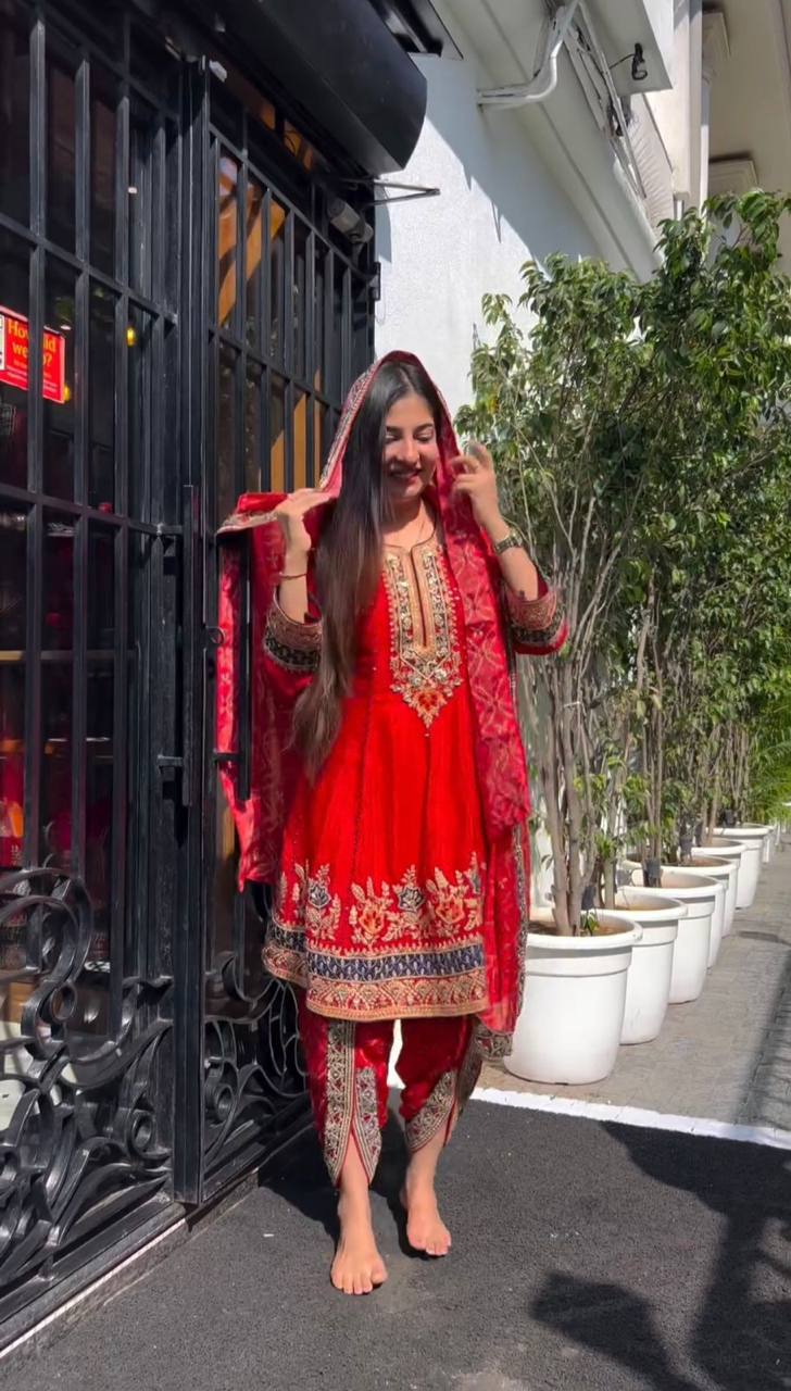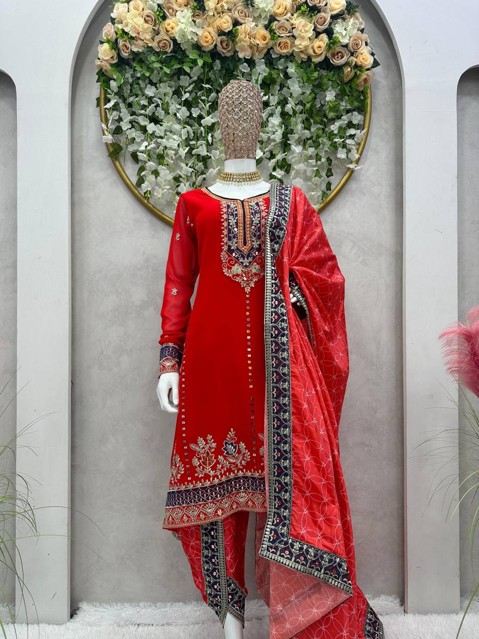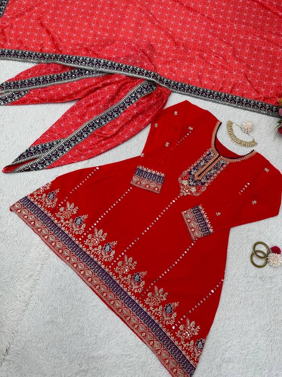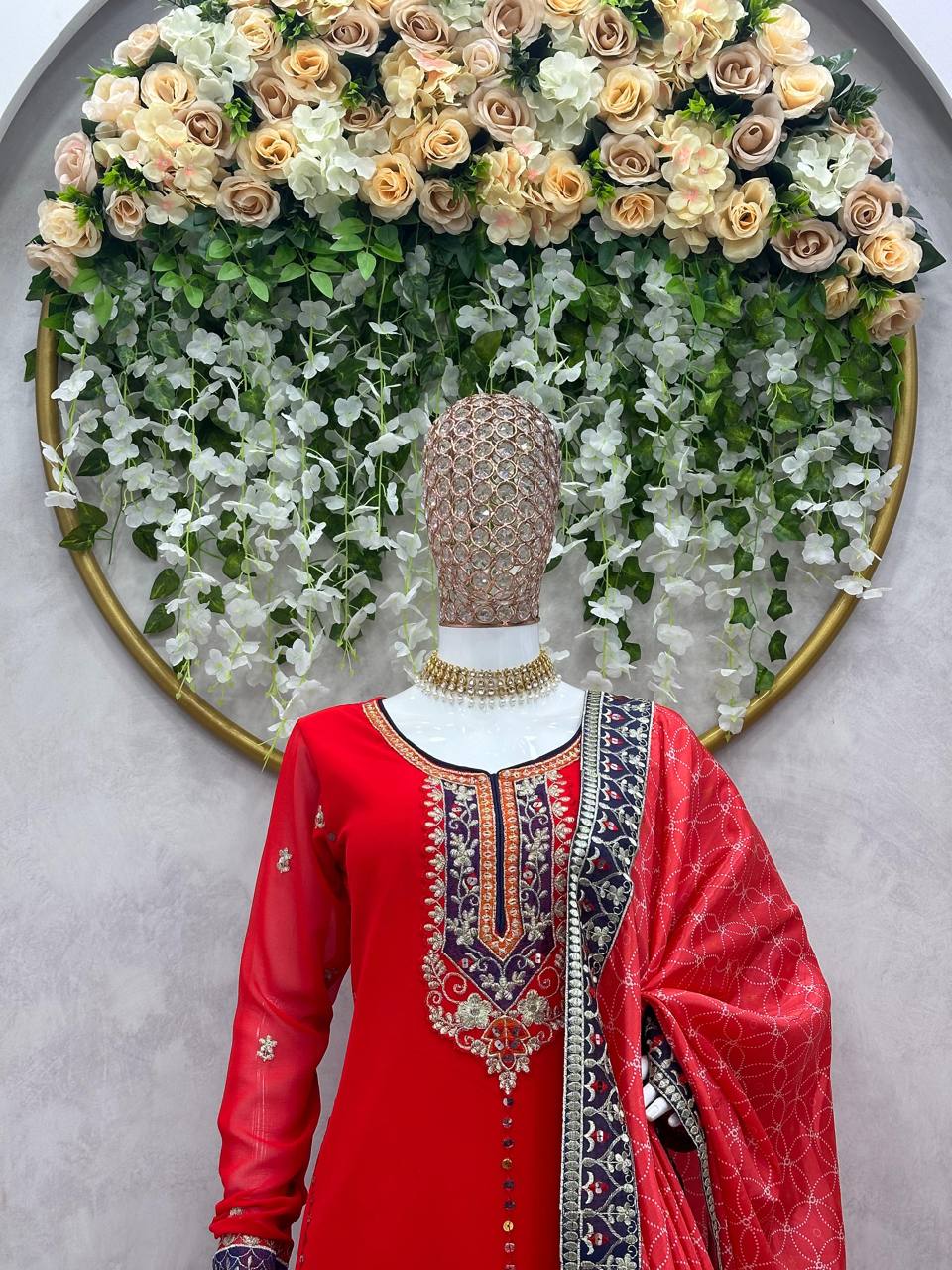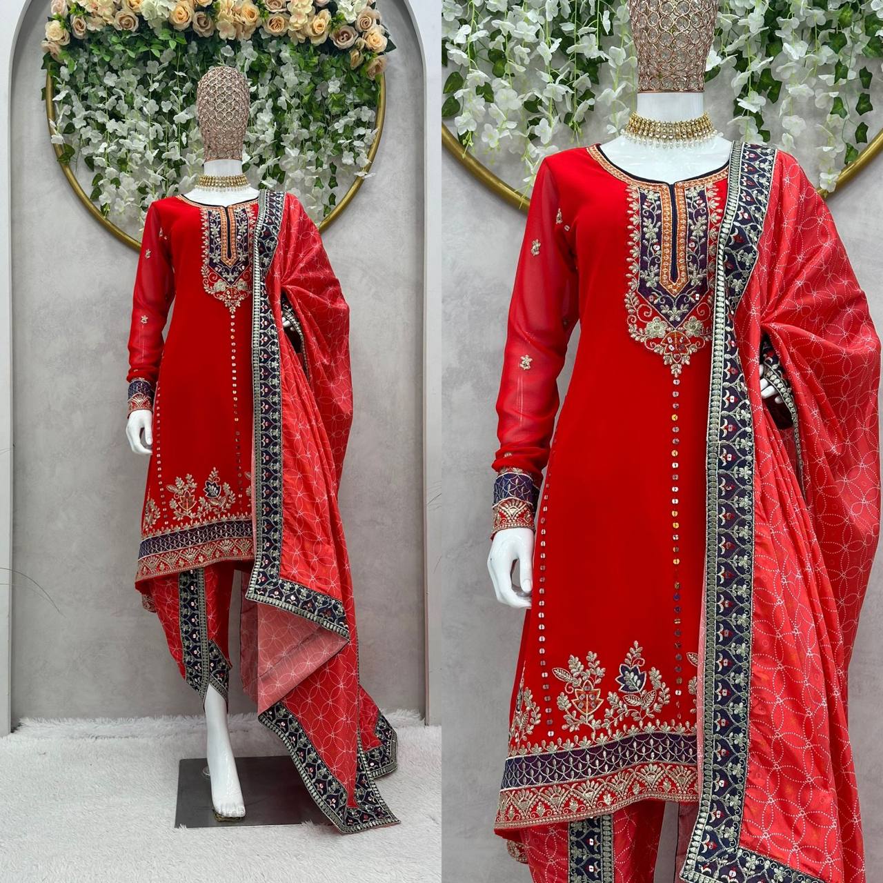 Red Colour Pinted And Embroidary Sequence Worked Stiched Dhoti Suit With Printed Duppta