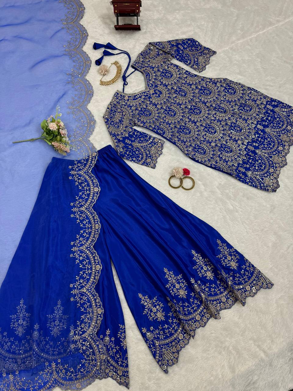 Wedding Wear Royal Blue Chion Silk Sharara Plazo Suit