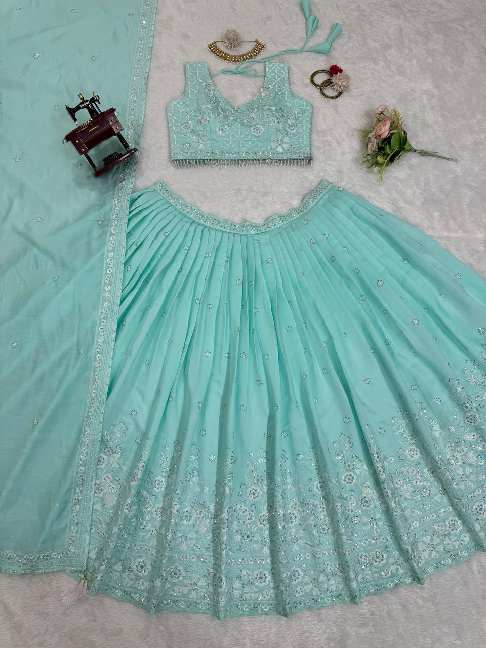 Sea Green Georgette Heavy Embroidered Wedding Lehenga Choli For Women