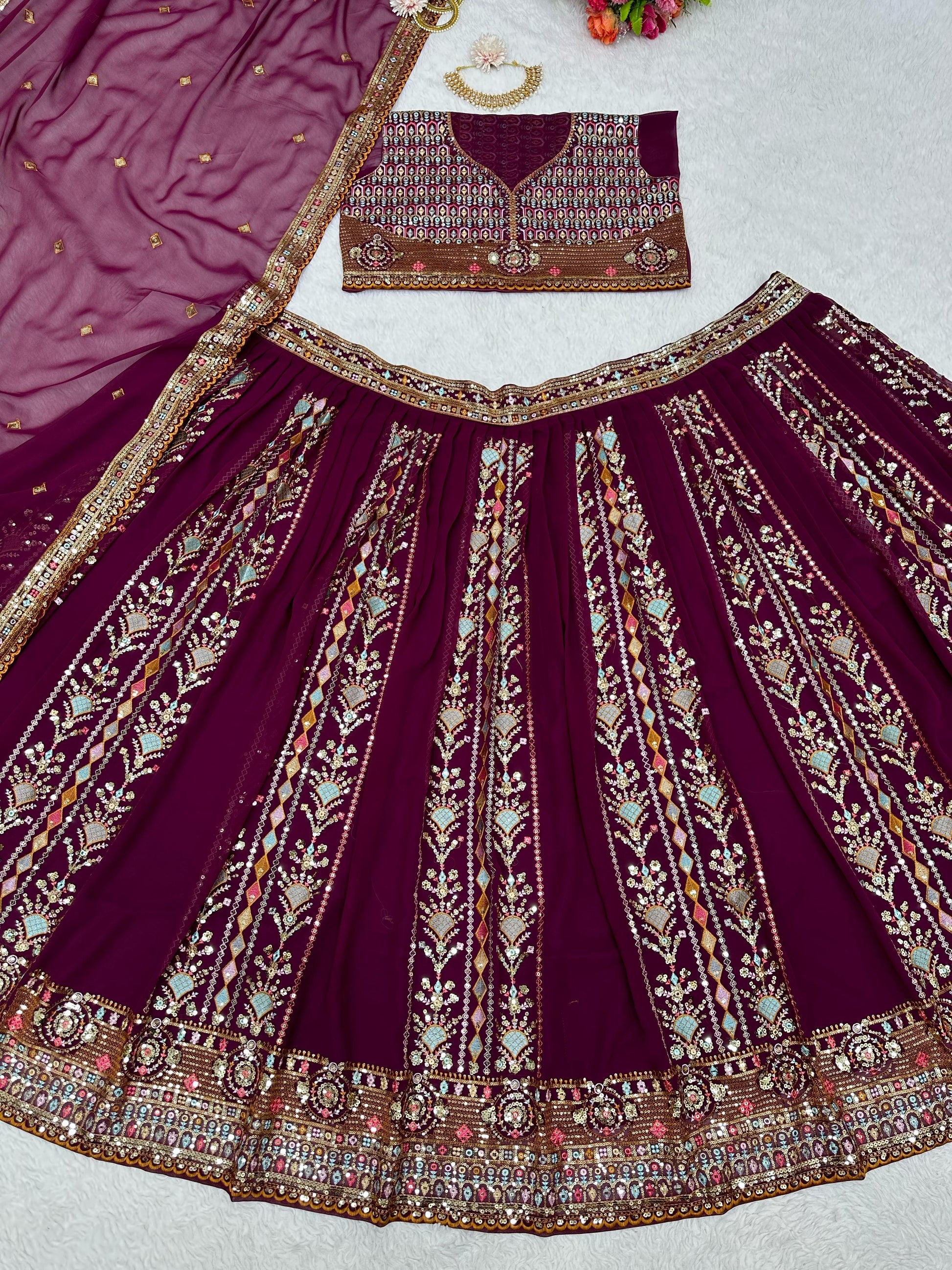 Wedding Wear Maroon Georgette Sequence Embroidered Lehenga Choli